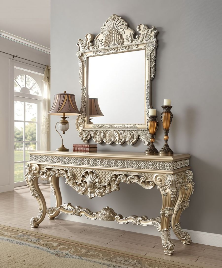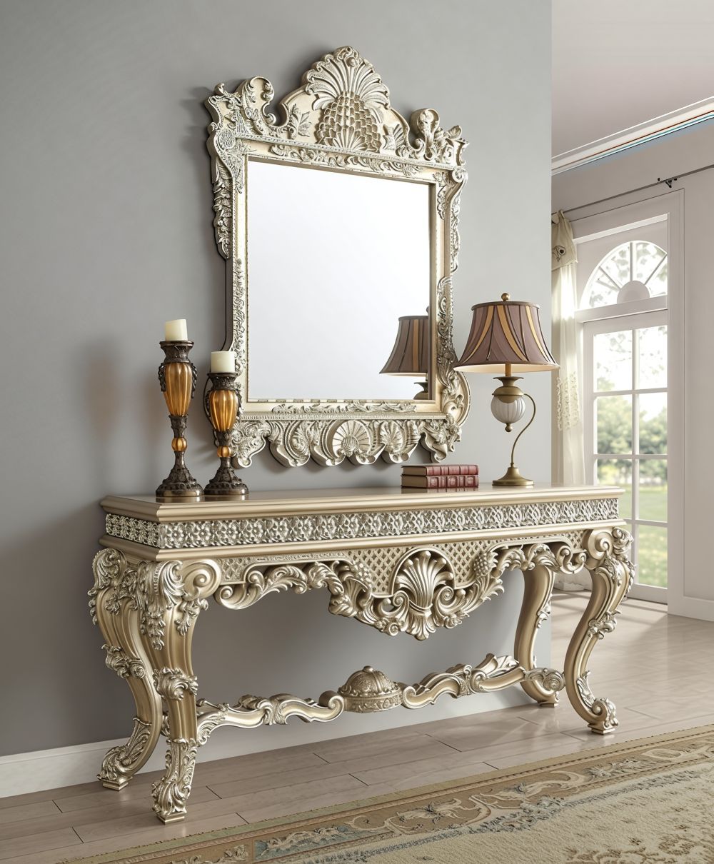 Ornate Hand-Carved Detailing: Features intricate wood carvings on both console and mirror, showcasing artisan craftsmanship.