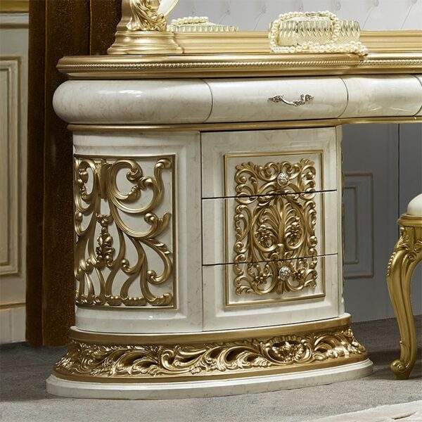 Coordinated vanity/dresser unit with a sculpted mirror frame and intricate golden crown carving