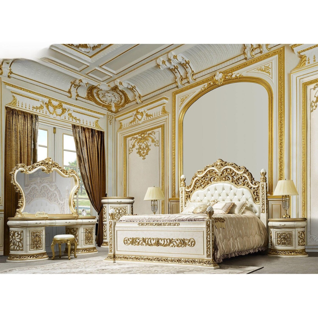 Hand-crafted European Baroque bedroom set featuring rich gold-leaf carving and palace-inspired detailing