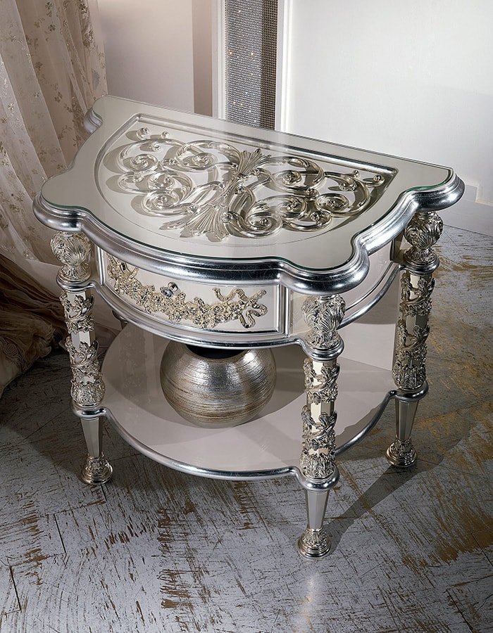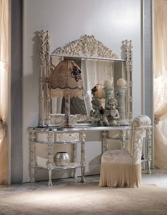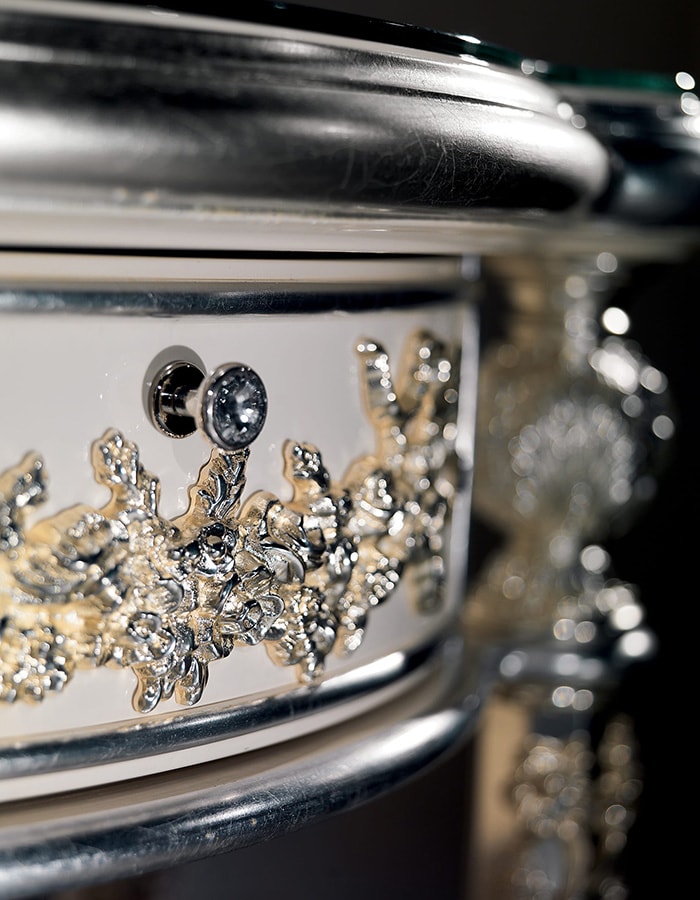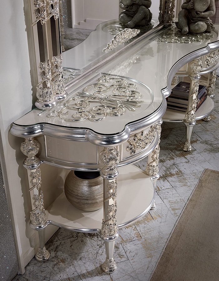 Silver leaf finishing applied by master artisans, giving the furniture a luxurious metallic sheen and an elite European palace character.