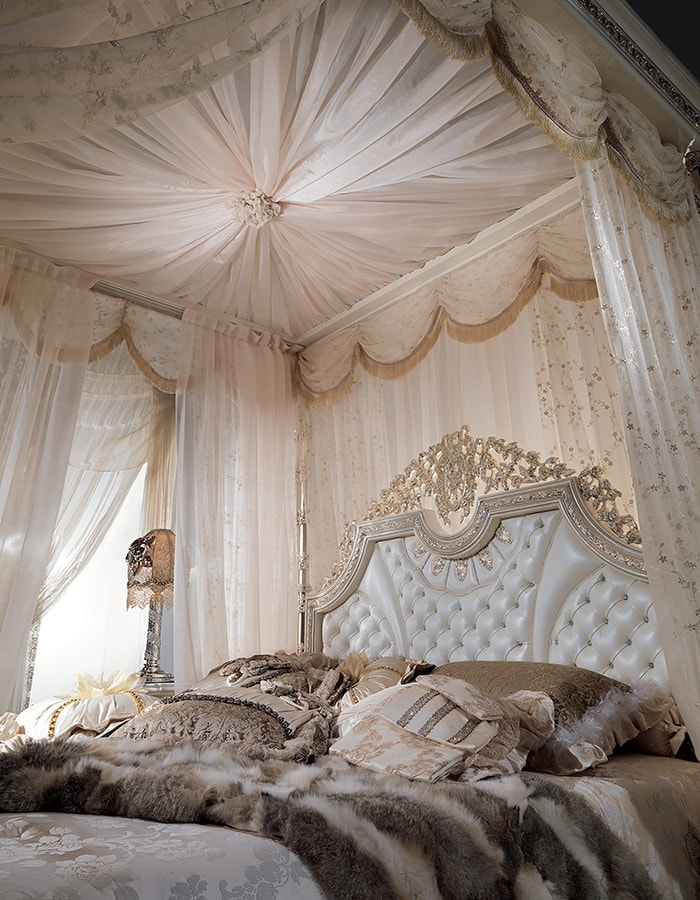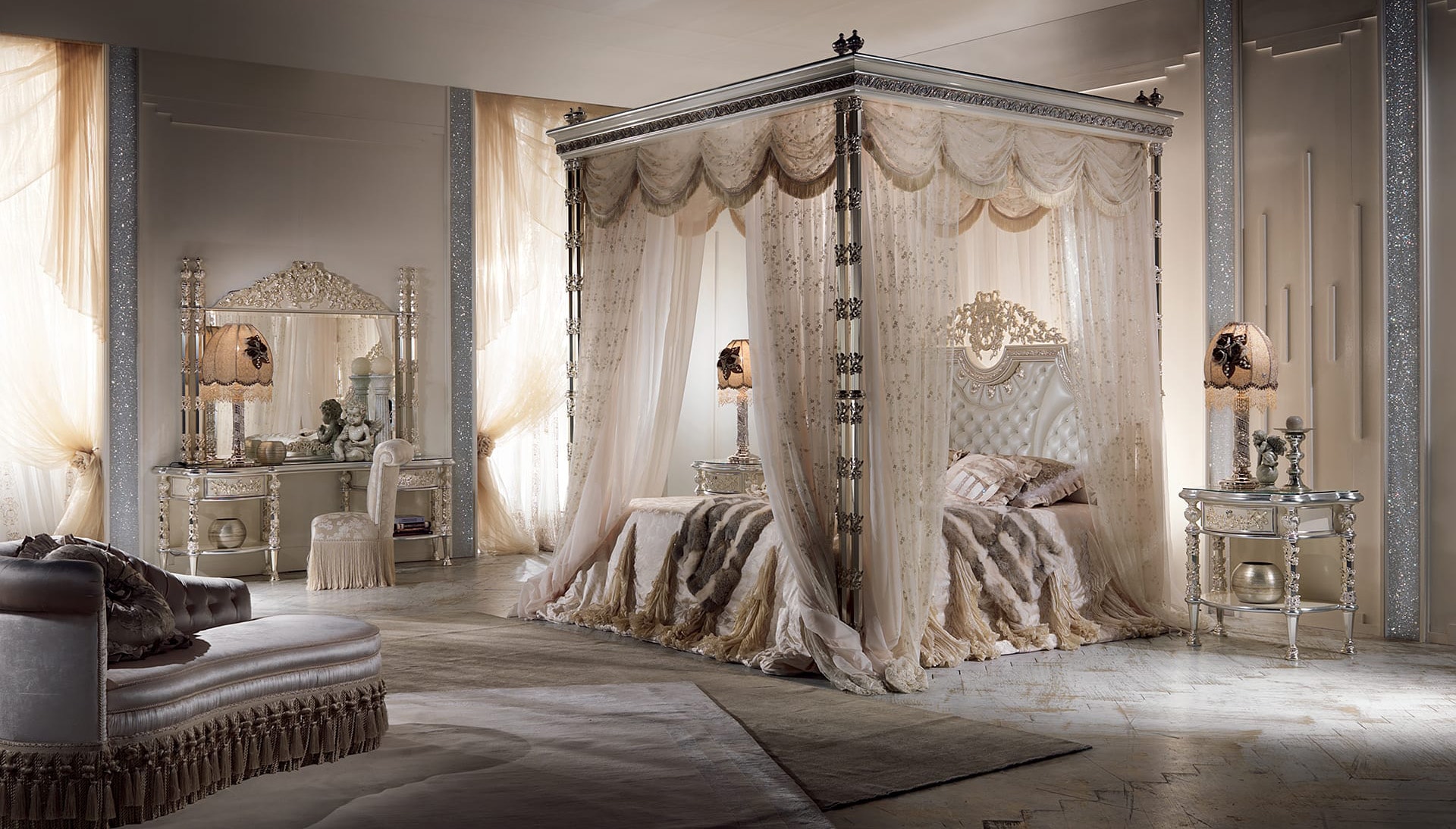 Hand-crafted heavy carvings throughout the bed, canopy structure, and supporting furniture, showcasing premium Baroque artistry in every detail.