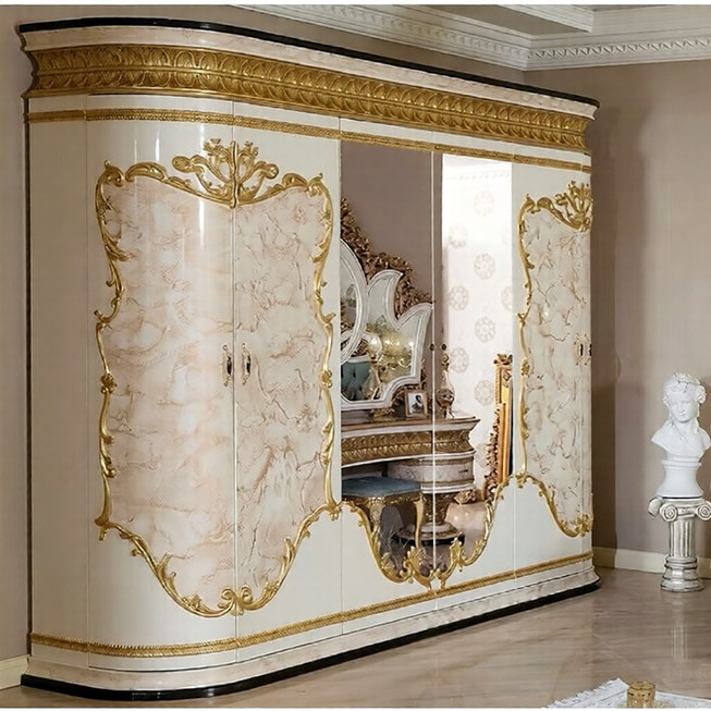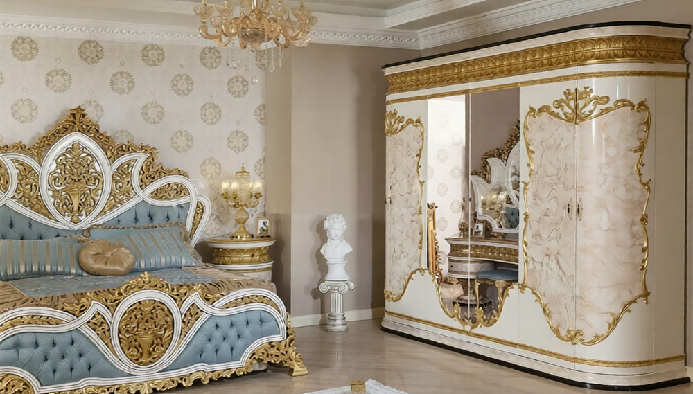 Set Included: Luxury Bed + 2 Night Stand + Dresser With Mirror + Wardrobe