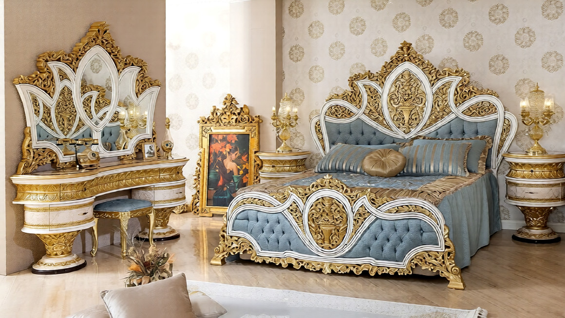 Majestic Heavy-Carved Headboard adorned with floral scrollwork, crown motifs, and handcrafted Victorian patterns that elevate the room’s elegance.