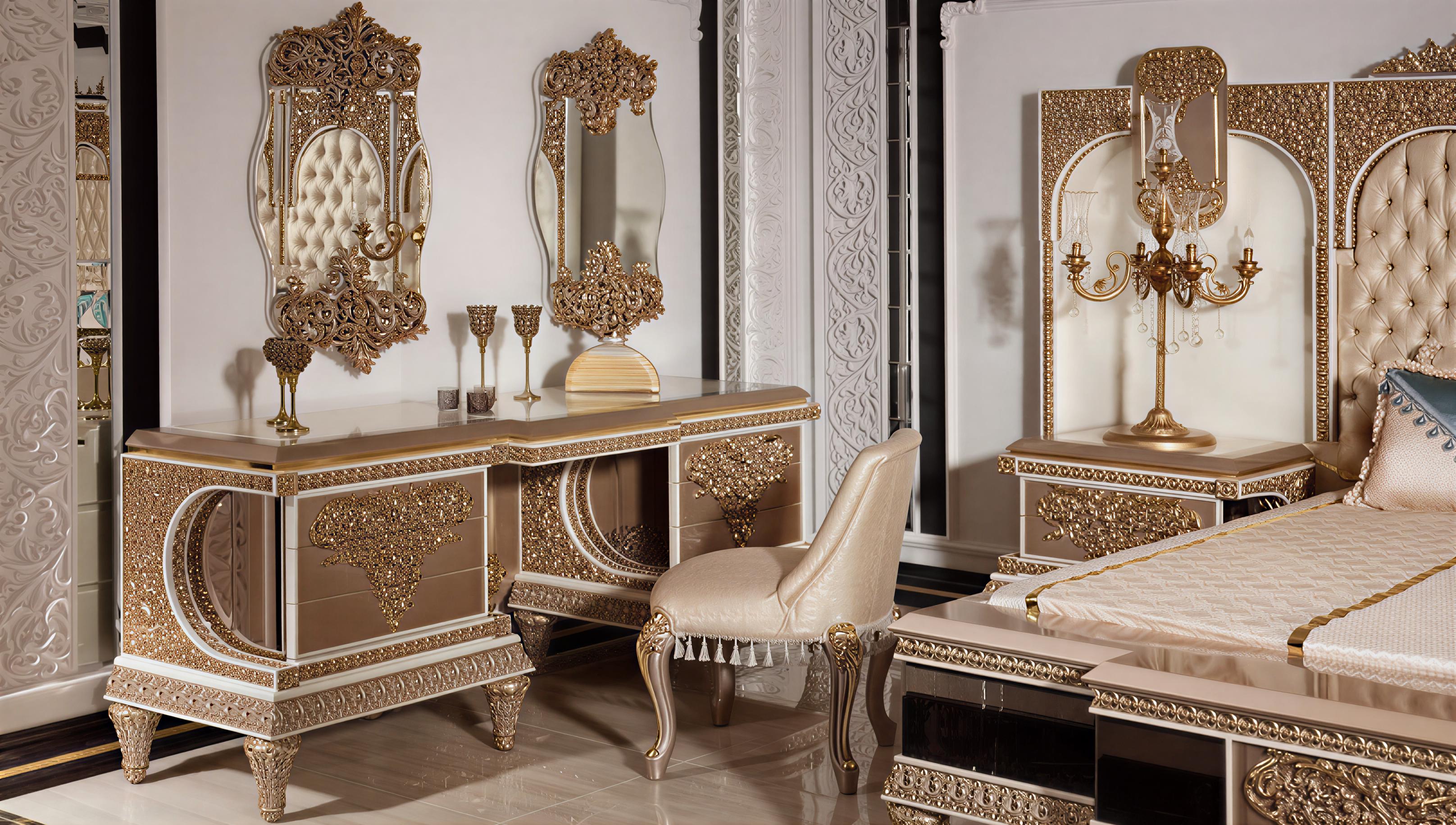 Set Included: Luxury Bed + 2 Night Stand + Dresser + 2 Mirror + Chair + Wardrobe