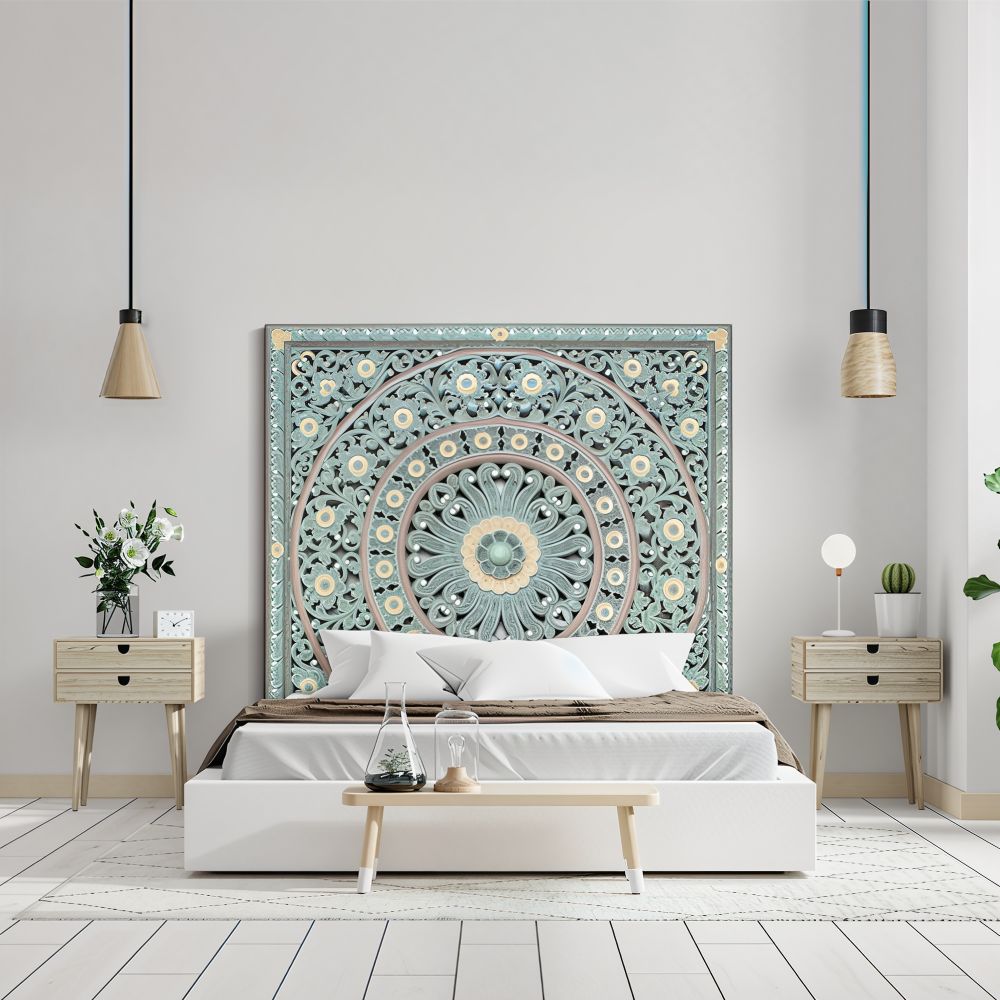 Headboard Design: Hand-carved, Mandala-inspired, Full-panel wooden headboard