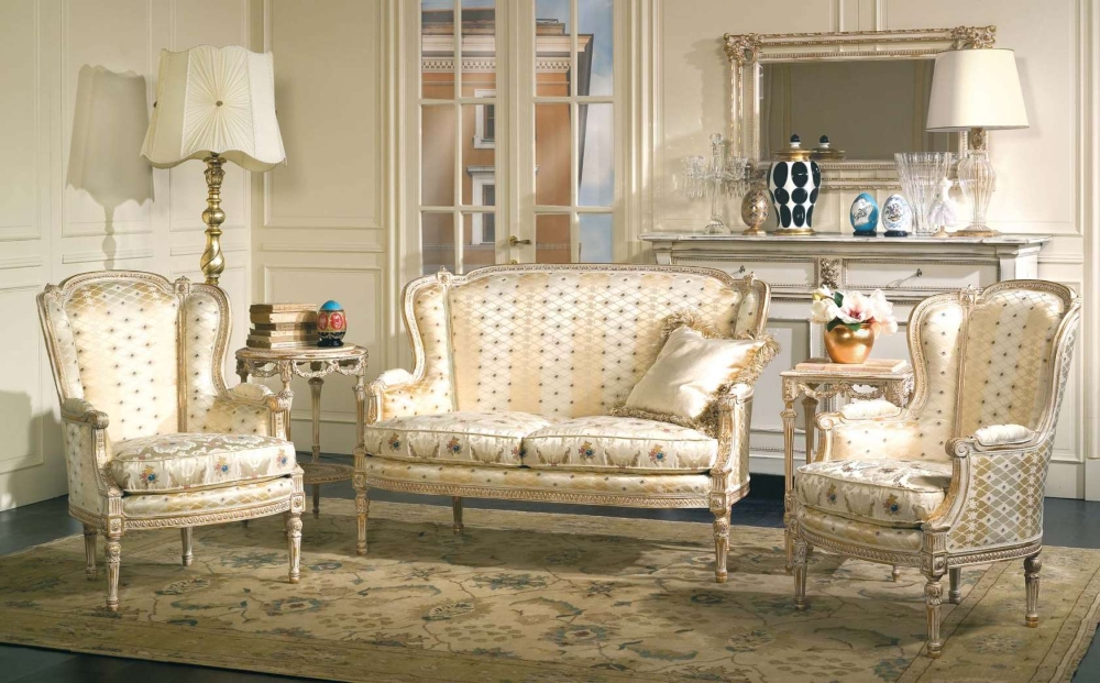 Complete Set Configuration: Includes one settee (sofa), two armchairs, and two matching side tables – perfect for a formal sitting room or grand salon.