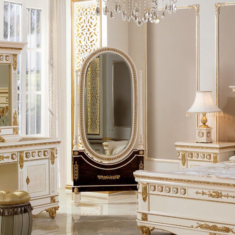 Set Included: Luxury Bed + 2 Night Stand + Dresser with Mirror + ottoman + Wardrobe + Floor Mirror