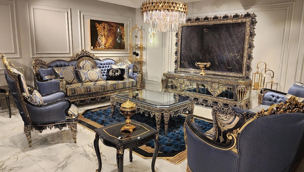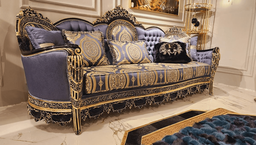 Rich blue upholstery combined with striking gold accents, creating a regal and sophisticated aesthetic