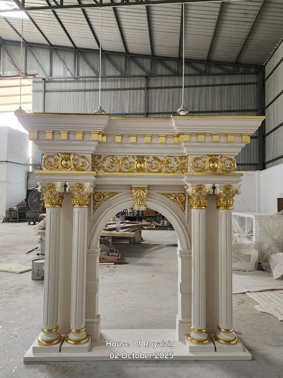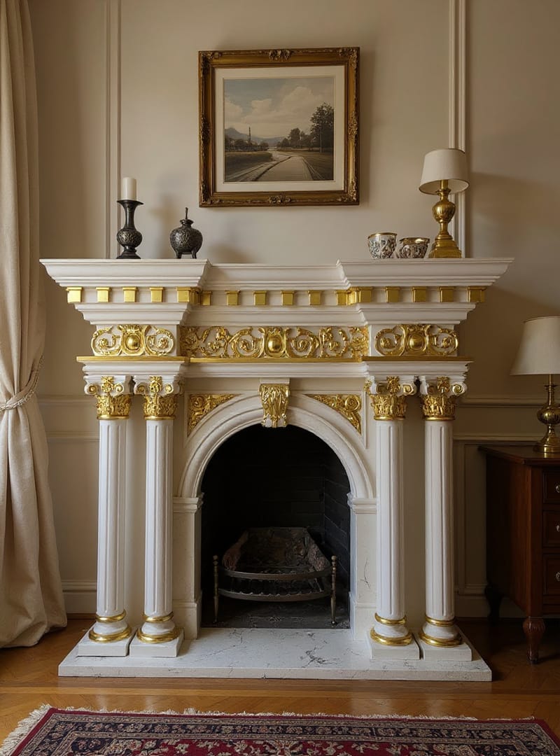Make a grand statement with this luxurious classic baroque fireplace mantel featuring exquisite gold leaf accents and elegant 4 round columns. The grand white finish is beautifully enhanced by intricate gold detailing, including decorative molding, carved flourishes, and column designs that showcase exceptional craftsmanship. The elaborate baroque styling creates a regal focal point perfect for formal living rooms, luxury homes, or spaces inspired by European palace design. This magnificent mantel combines classical architectural elements with opulent gold accents to create a truly spectacular centerpiece that exudes sophistication and grandeur.