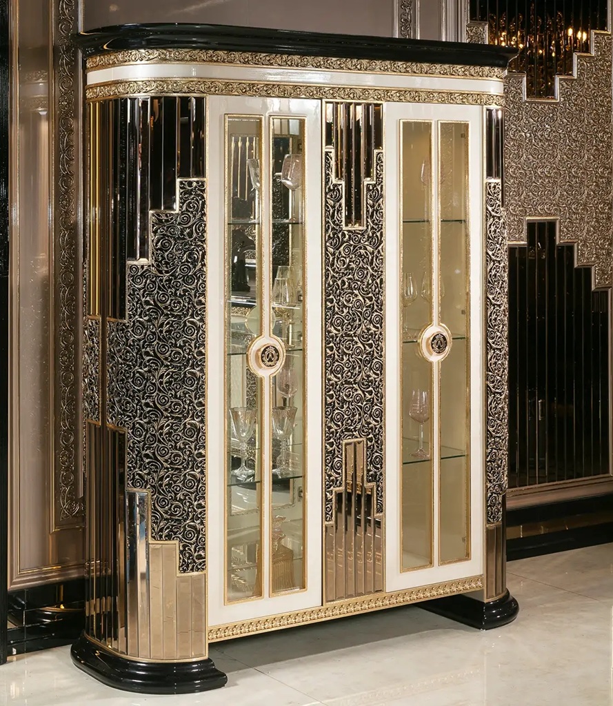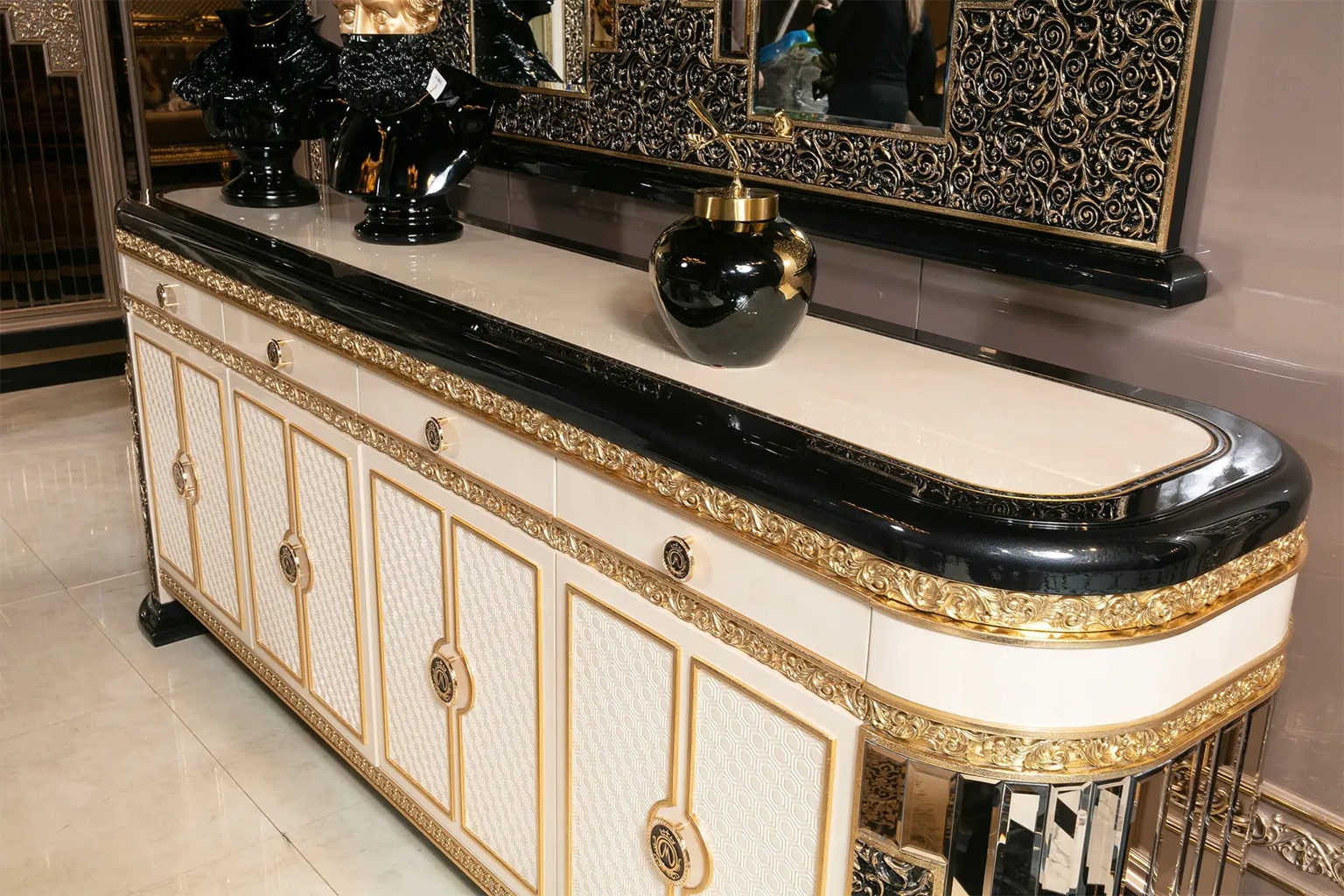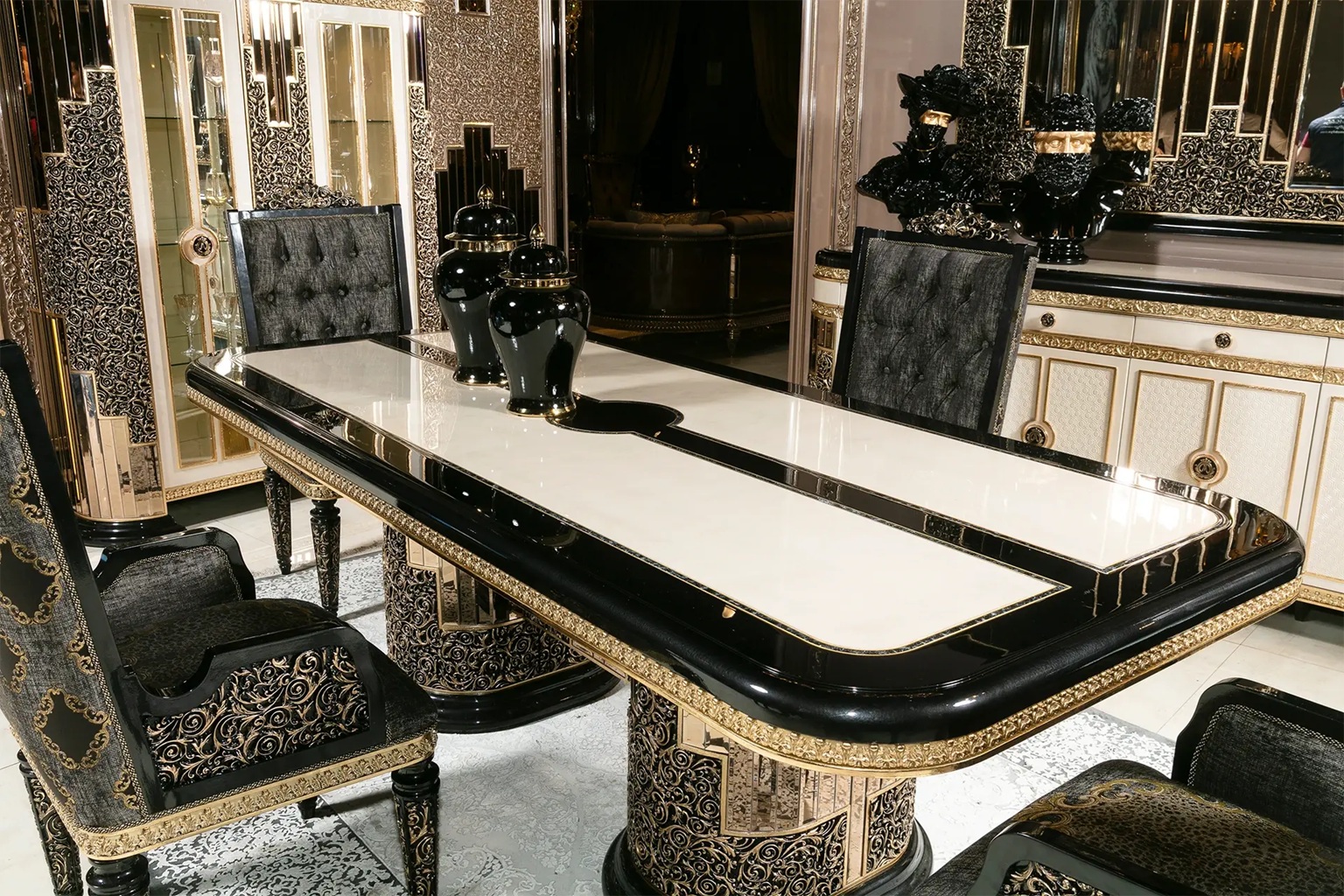 Luxurious Black & Gold Finish: The bold black tones are beautifully contrasted with shimmering gold inlays and mirrored accents, adding opulence to any dining space.