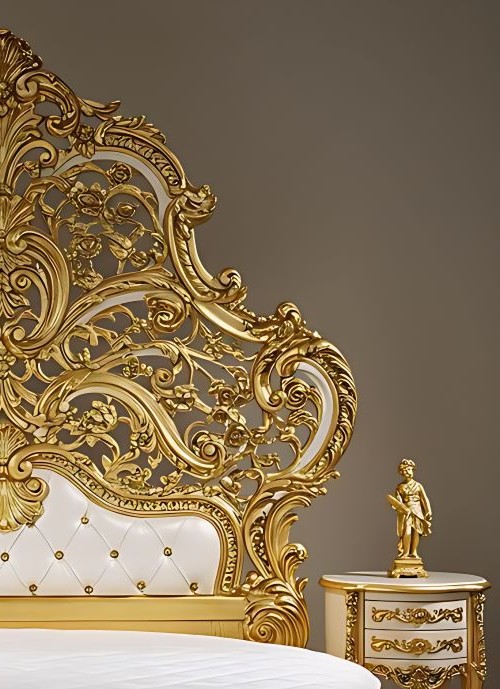 Exquisite Baroque Design: Showcases a classic Baroque-inspired aesthetic with intricate gold carvings and elegant curves, perfect for creating a royal bedroom atmosphere.