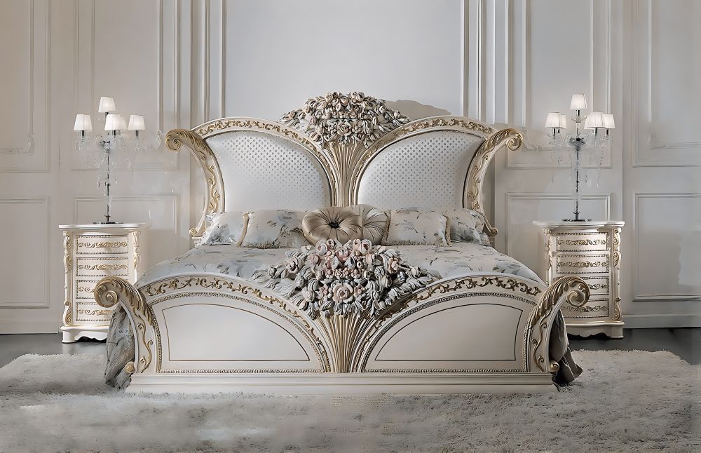 Dual-Panel Curved Headboard Design with symmetrical floral bouquets, giving a balanced and majestic royal appearance.